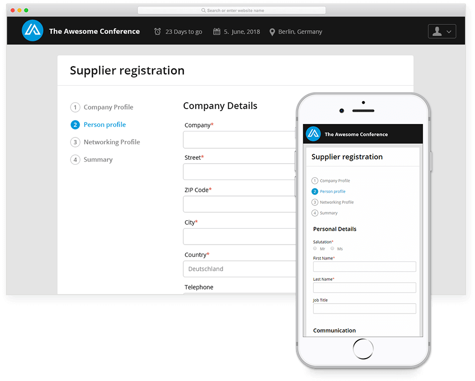 Bei der Registrierung für Sie als Teilnehmer haben wir auf ein durchdachtes Workflow geachtet. Achten Sie darauf, die richtige Teilnehmerkategorie zu wählen und stimmen Sie unseren Datenschutzbestimmungen zu. Erfassen Sie Ihr Unternehmensprofil und Ihre Personendaten. Im Networkingprofil beschreiben Sie die Ziele Ihrer Teilnahme und Wünsche an Ihre Gesprächspartner, um den perfekten Match unter Ihren Mitteilnehmern zu finden.