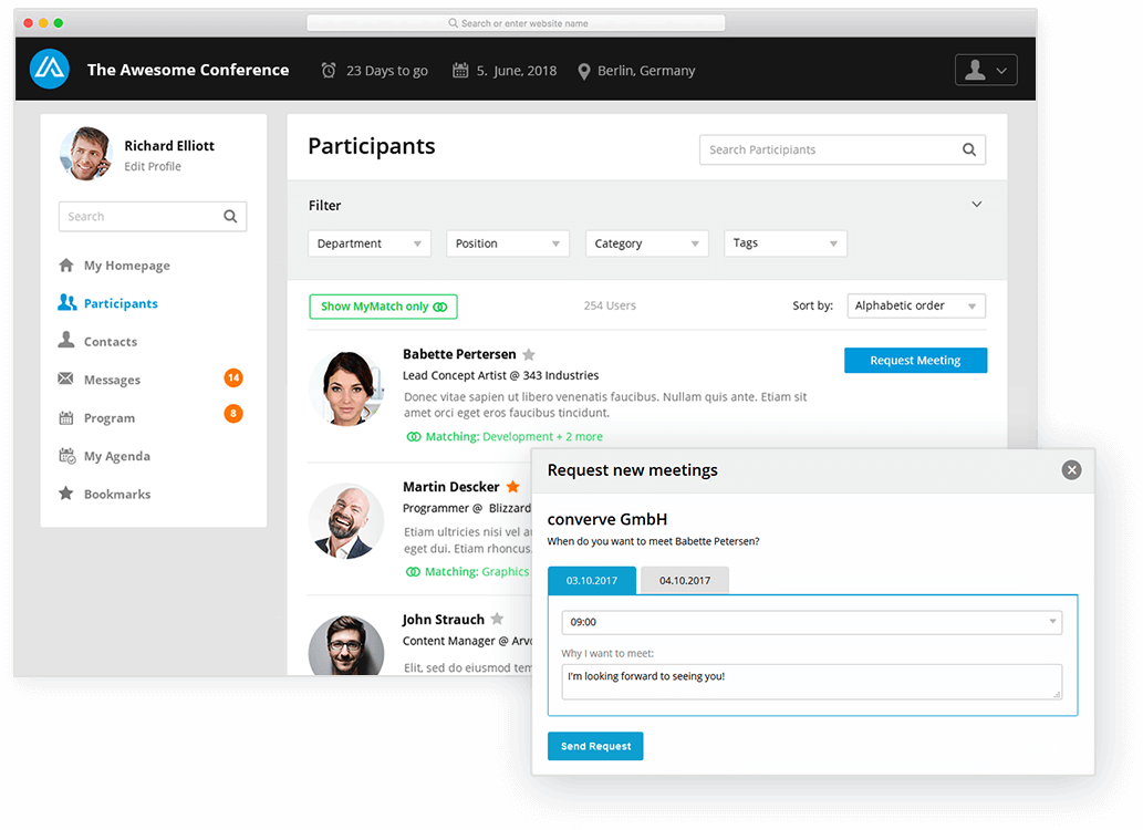 Unser Matchmaking Algorithmus wird Ihnen Vorschläge machen, wer unter den anderen Teilnehmer ein passender Gesprächspartner für Sie ist. Oder Sie nutzen die Suche und Filtermöglichkeiten, um für Sie interessante Teilnehmer zu finden. Fragen Sie Gesprächstermine an und entscheiden Sie, ob Sie ankommende Terminanfragen zustimmen oder ablehnen möchten. So füllt sich ihr Kalender mit vorterminierten Gesprächen und interessierten Gesprächspartnern. Der Ort der Gespräche kann durch Sie oder den Veranstalter festgelegt werden.