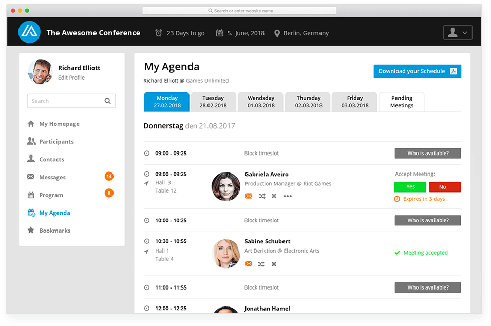 Versenden und empfangen Sie Nachrichten, blockieren Sie Timeslots und bauen Sie Ihre Favoritenliste auf. Wir bieten Ihnen alle Tools, um ihre geschäftliches Netzwerk während dieser Veranstaltung nachhaltig zu erweitern.